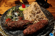 Mujadra com kafta, feito com arroz aromático, lentilha, cebola crispy e especiarias árabes, servido com duas kaftas e um refrescante tabule mediterrâneo.