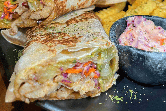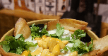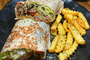 Feito com frango marinado em especiarias libanesas, batata crinkler, alface, repolho roxo, cenoura, maionese artesanal