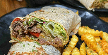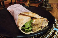 Kebab composto com berinjela, kafta com especiarias sírias - libanesas, iogurte, molho de tahine, tomate grape, alface, cebola roxa, enrolado com pão sírio - pão folha.