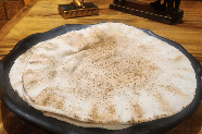 Um pão Sirio, ideal para comer com as pastas "Trio Faraônico" que vem coalhada, húmus e babaganush.