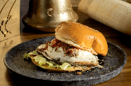 Suculento File de Frango (120g) com tomate grape, alface americana, um derretido queijo muçarela, maionese de bacon no pão de brioche.