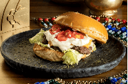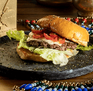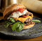 Hambúrguer gourmet bovino com queijo cheddar, queijo muçarela, cebola roxa grelhada, bacon e Maionese da casa no pão de brioche.