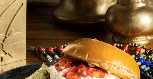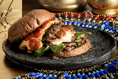 Kibe na chapa esmagado no pão Sírio, pasta de Babaganoush, tomate grape, cebola roxa, queijo mussarela, hortela - especiarias Sírias-Libanesas.