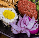 Um delicioso kibe crú com temperos mediterrâneos, servido com tabule, cebola crispy e colhada.